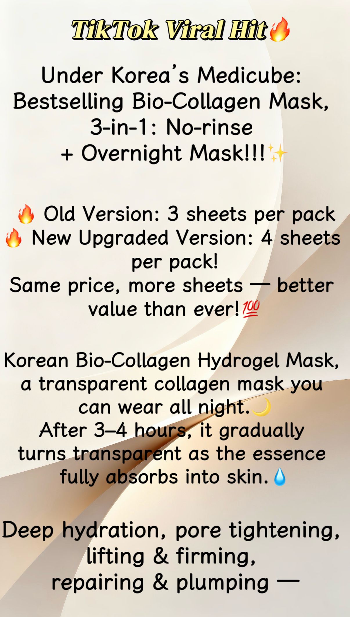 4-Pack | Korean Bio-Collagen Hydrogel Mask, Overnight Use, Lifting & Pore Minimizing, Moisturizing & Repairing Transparent Mask